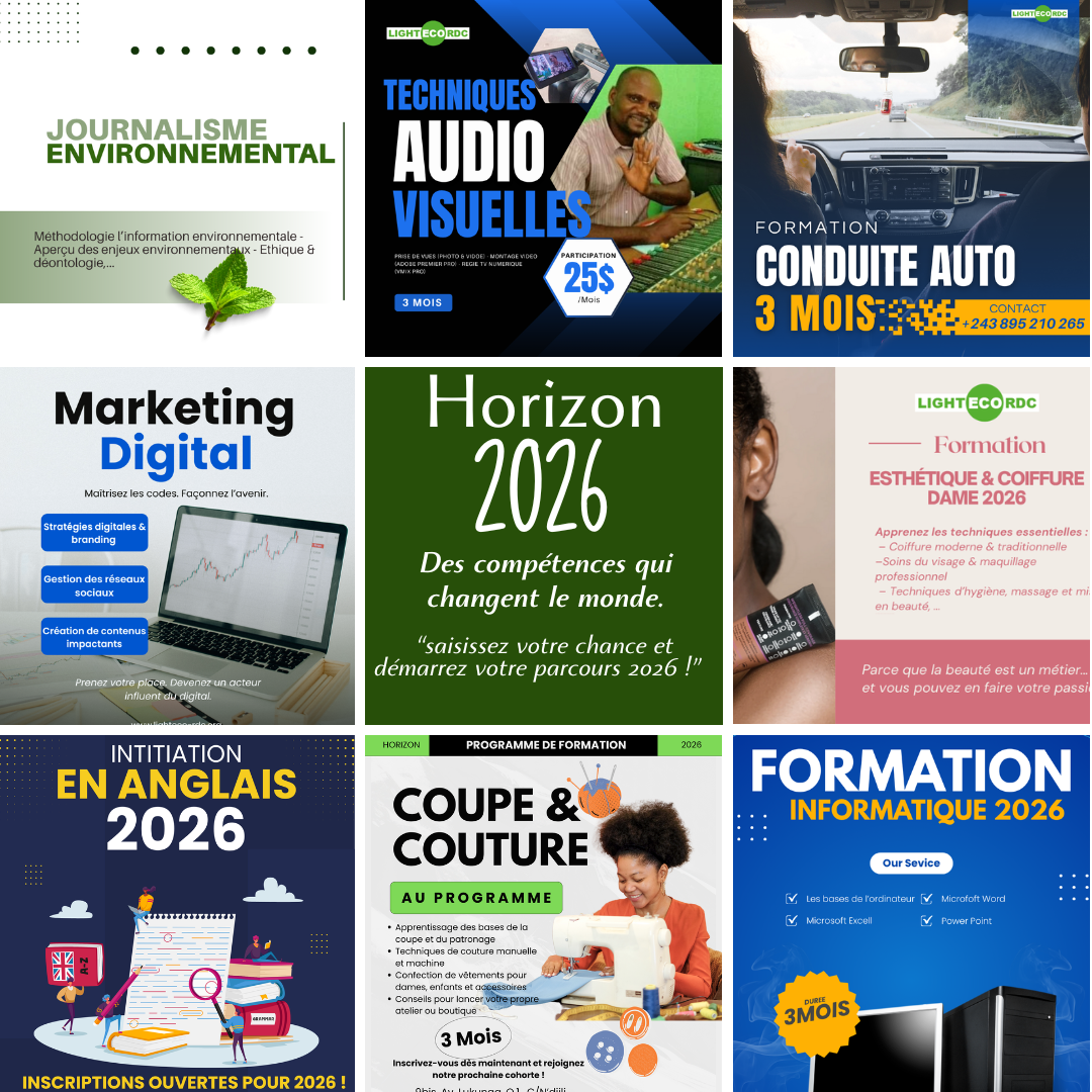 Chez LIGHT ECO RDC, nous avons conçu un programme ambitieux et complet pour accompagner les jeunes et les professionnels dans l’acquisition de compétences modernes et durables. Horizon 2026, c’est plus qu’un programme : c’est une véritable passerelle vers l’avenir, où chaque participant peut développer son potentiel et contribuer activement au développement durable de la RDC.